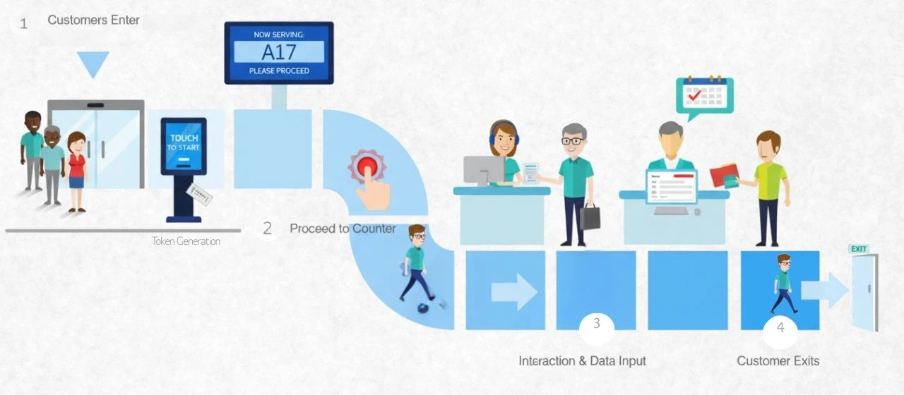 - The system assigns their place in the queue and shows real-time updates on screens or phones.