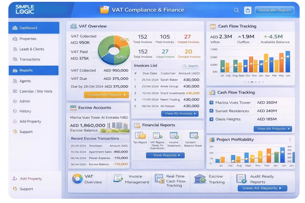 An ERP system can assist with managing both VAT and the escrow process, as well as manage SPAs in a compliant way that ensures adherence to UAE laws. - Making Better Decisions Based on Data